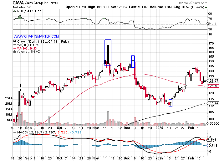 Yet another strong casual diner overall in CAVA has been influenced by the doji candle. On 1/14 it put in a doji near 110 and rallied 35 points. It is possible the recent action is a handle on a cup base and Friday's bullish hammer at the 50-day SMA is a good area to play against on the long side. Notice the doji on 11/13 which cut into the large filled-in black candle from its last earnings reaction on 11/13 which CLOSED 25 handles off its intraday high was a good place to be cautious and the stock did respond lower.