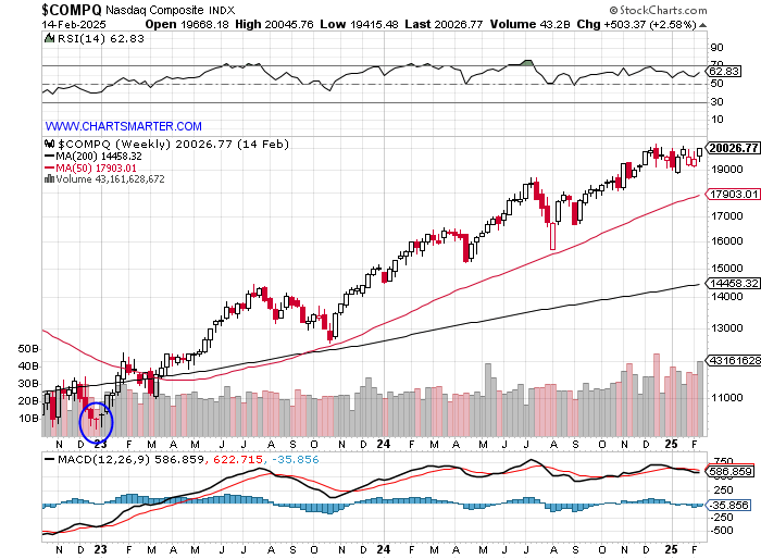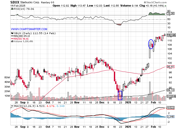 The casual diner SBUX has been in the news with the high-profile CEO change last August, and this name put in a bottom on 12/23 with the doji candle on 12/23 right at the 200-day SMA. It recorded another one on 1/30 the day after a spirited earnings-related advance of 8.1%. The fact that the stock is continuing to move higher despite it could be a tell that PRICE will likely keep advancing into 2025. Additionally notice RSI has been above the overbought 70 number since that candle and we know there is nothing more bullish than an overbought situation that remains that way.