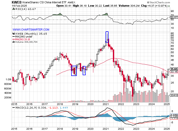 China has been dominating financial headlines and below is the MONTHLY chart of the KWEB, and notice how a rare doji candle (gravestone) was recorded in February 2021 right at the very round 90 number. It plunged to a low of 15 in October 2022 before it started to slowly floor. That was preceded by a bullish dragonfly doji in August 2019 that cut into the big bullish engulfing candle from January 2019 adding to the sanguine theme. Notice so far in February it is moving above its 50 MONTH SMA for the first time since the summer of 2021.