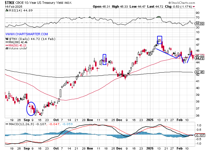 Below is the daily chart of the ten-year yield and one can see how the doji played a role with the potential bottom on 9/6 (circled) and it came several sessions later. On 11/15 another one was recorded and that led to a quick 40 basis point move lower. The doji on 1/14 was also a bearish harami cross and has given equity markets a boost since and the quick failure with last Wednesday's break above a double bottom near 4.6% is a red flag.