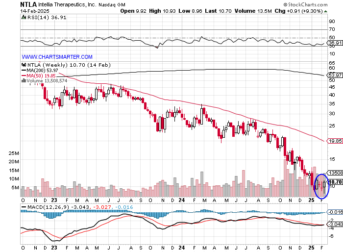 With all the rage coming back to Cathy Woods many are peering into her holdings in the ARKG, many of which have been acting powerfully. Below is the WEEKLY chart of NTLA (REPORTS this Thursday before the open) and although I am not a bottom feeder, this name could be putting in a low here with back-to-back doji candles the weeks ending 1/31 and 2/7 (the only ones in at least the last 2 years). Round number theory is coming into play at the very round 10 figure and once can see the positive RSI divergence on the daily chart here. Treat this as pure speculation.